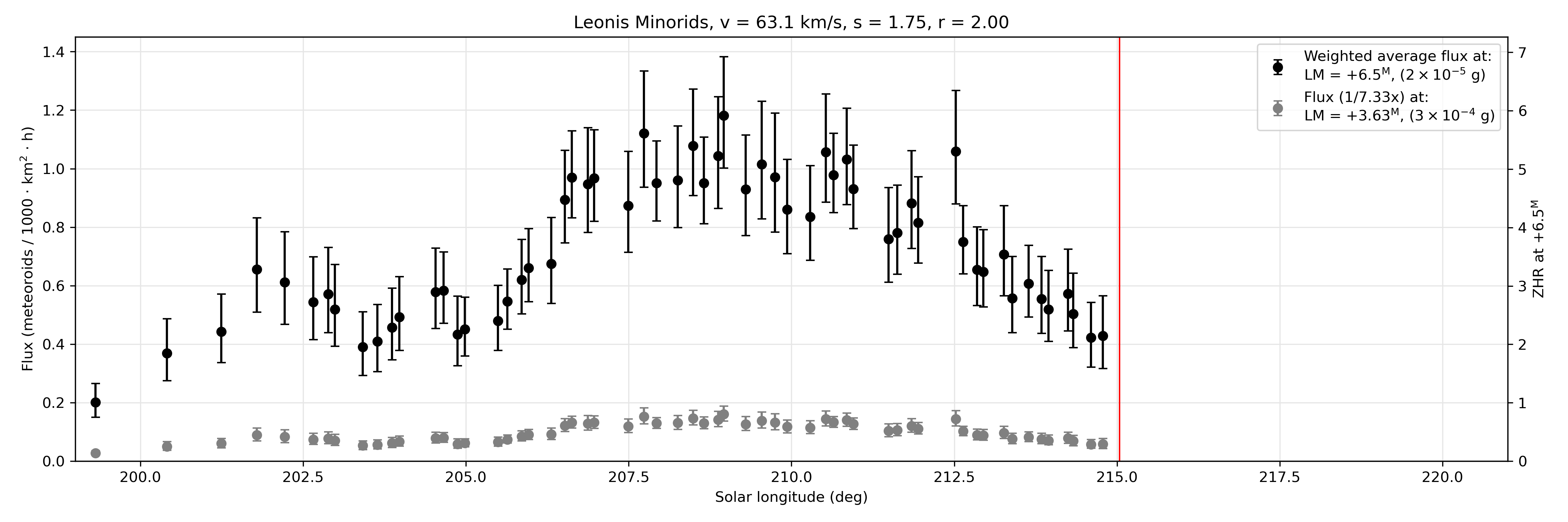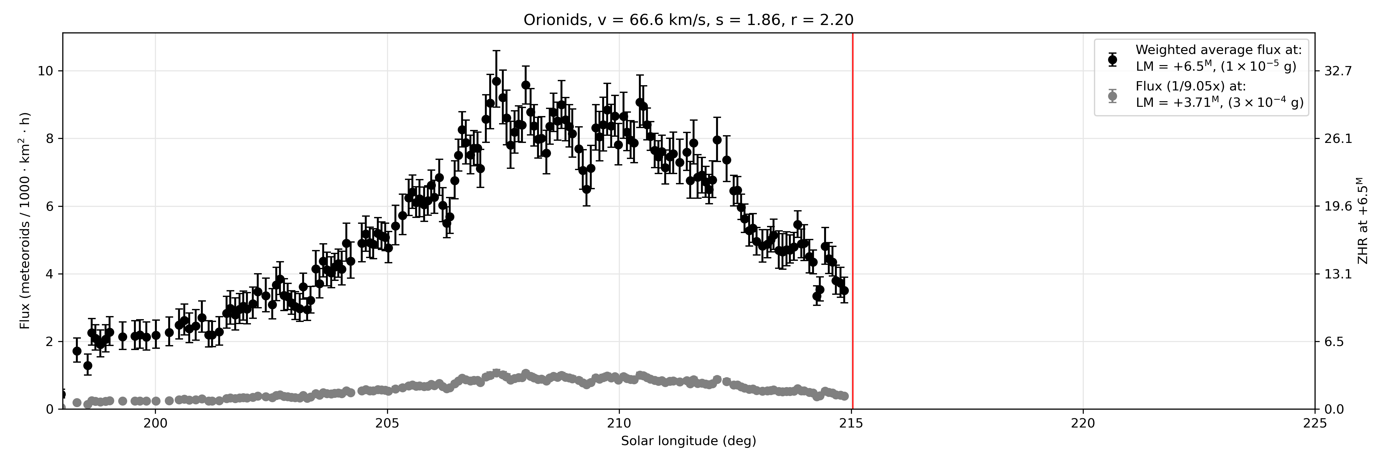 The plots show the measured physical meteor flux (left hand axis) while the equivalent Zenithal Hourly Rate (number of meteors an observer would see under ideal skies with the radiant overhead in an hour) is shown on the right axis as a function of solar longitude (J2000). The assumed population index (which is used to convert flux to ZHR) is assumed constant over the duration of the shower is shown in the header. The equivalent flux to a limiting meteor absolute magnitude of +6.5 and the average limiting meteor magnitude for the measurements are shown, where the equivalent meteoroid mass uses the Mass-Magnitude-Velocity relationship of Verniani (1973). Uncertainties reflect Poisson statistics only (95% confidence interval).