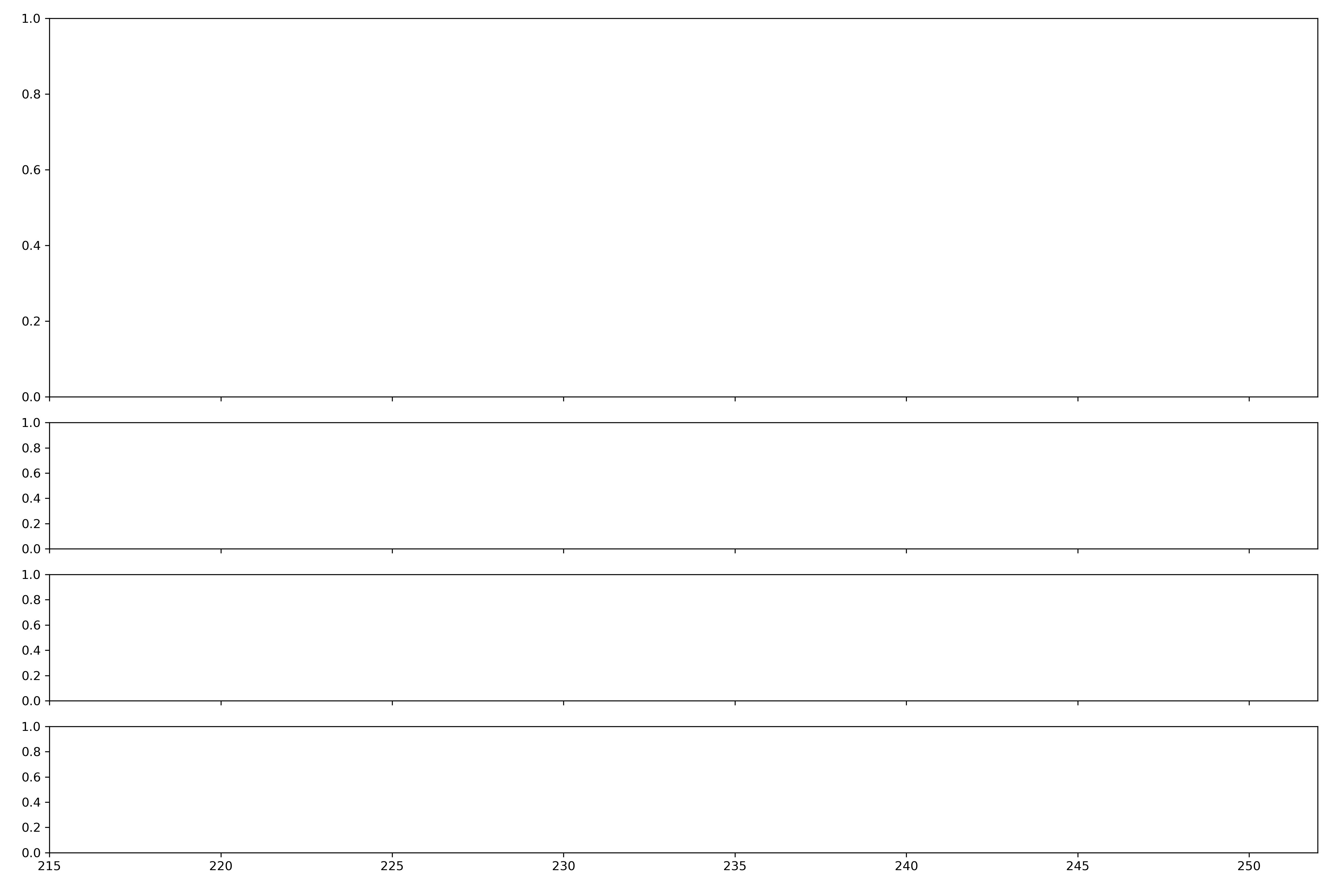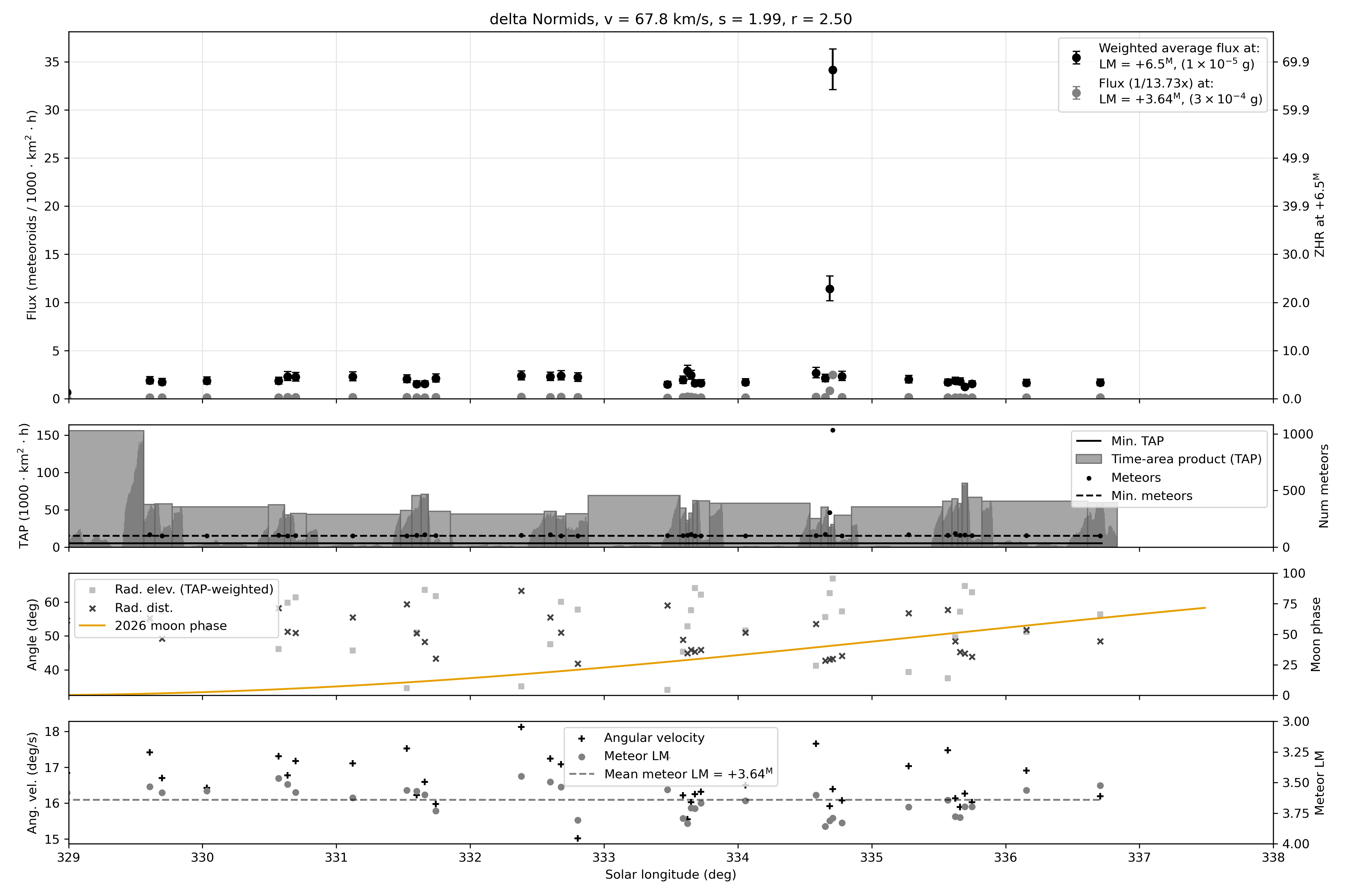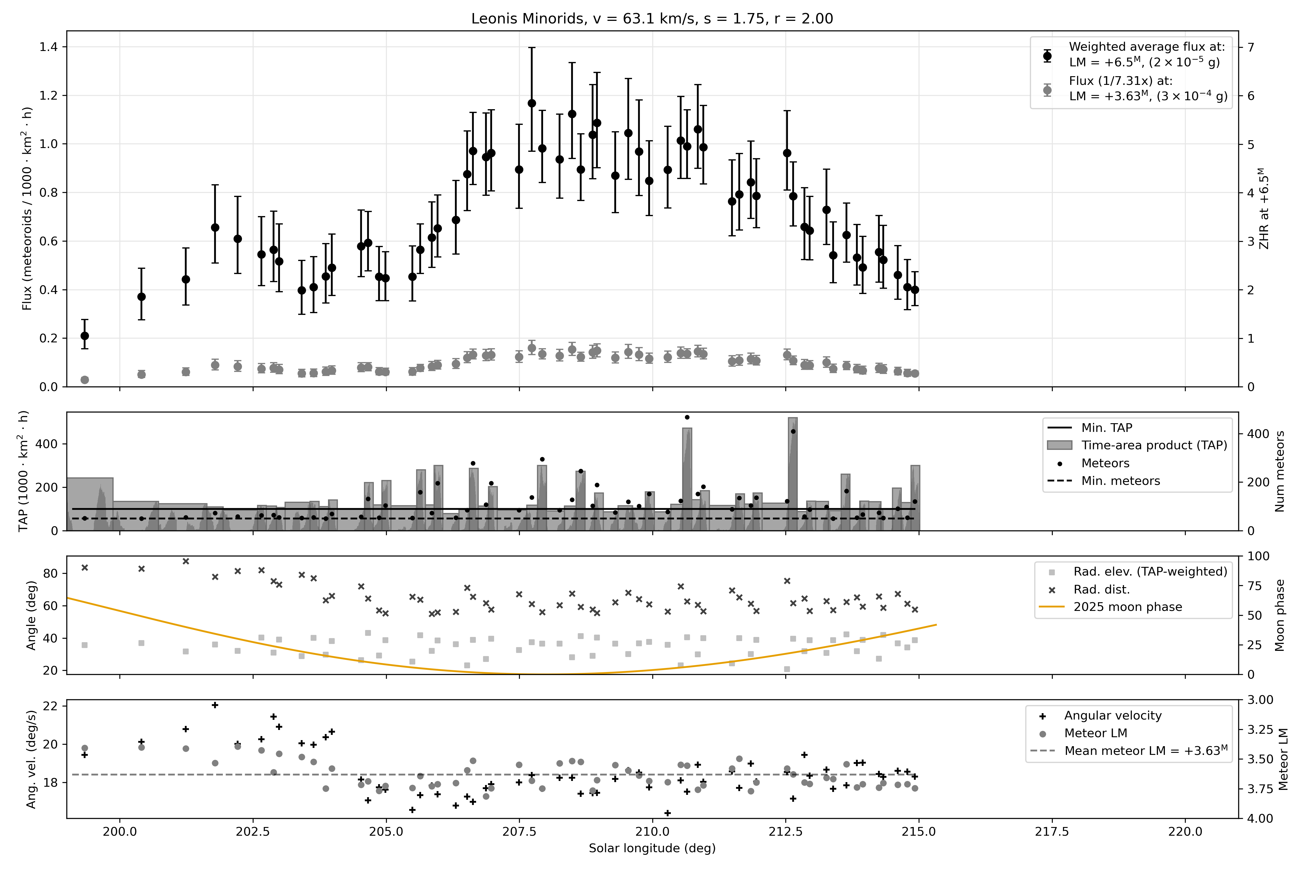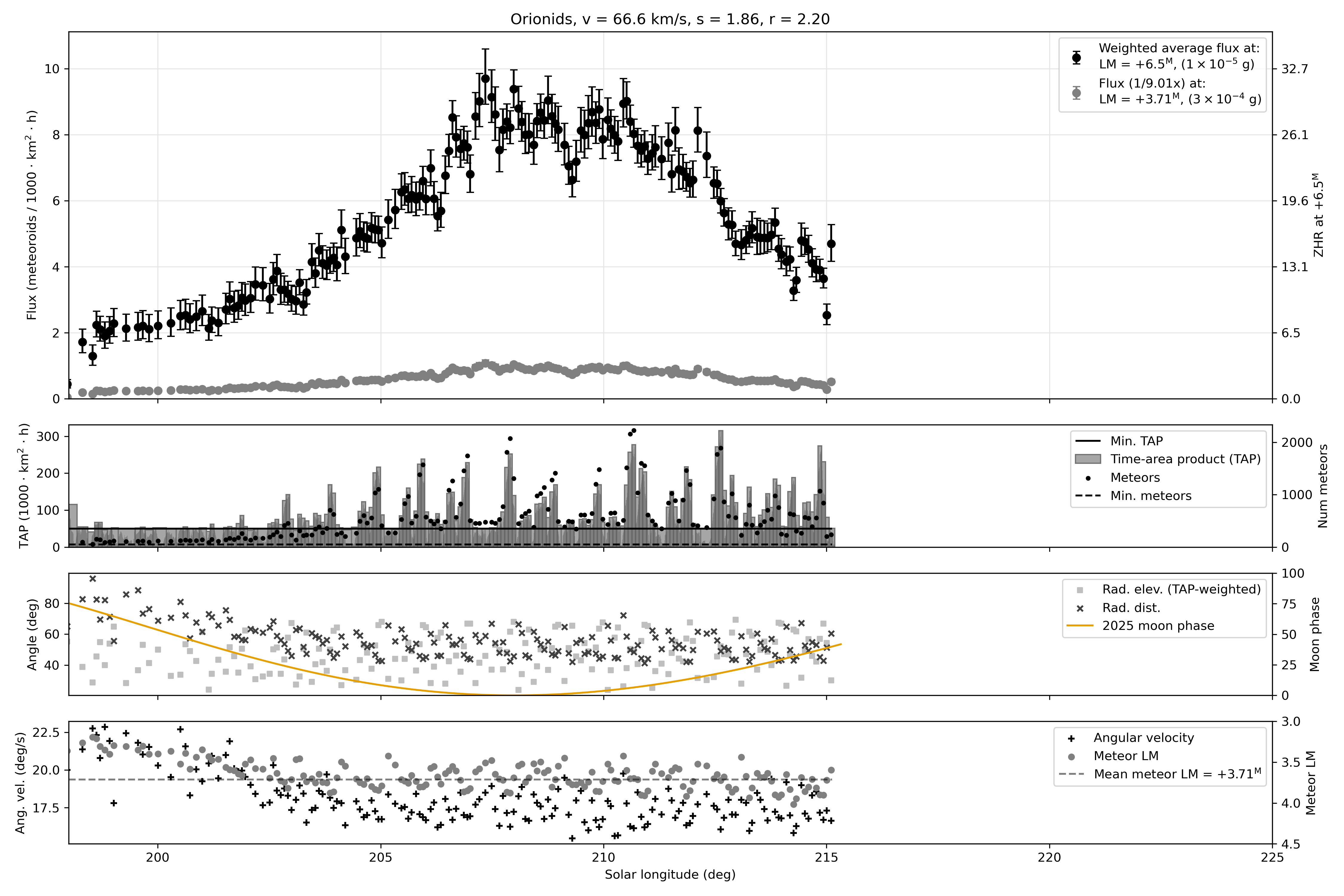 When a plot on the front page is clicked, a full plot including additional metadata will open. The second inset in the full plot shows the number of single station meteors associated to the shower by all cameras in varying time bins (black dots). The per bin equivalent time-area-product (TAP) of coverage in the atmosphere (in units of 1000 km2 hr) is also shown. The time bin sizes are computed by requiring each bin to contain a minimum number of meteors (min meteors) and a minimum TAP.
