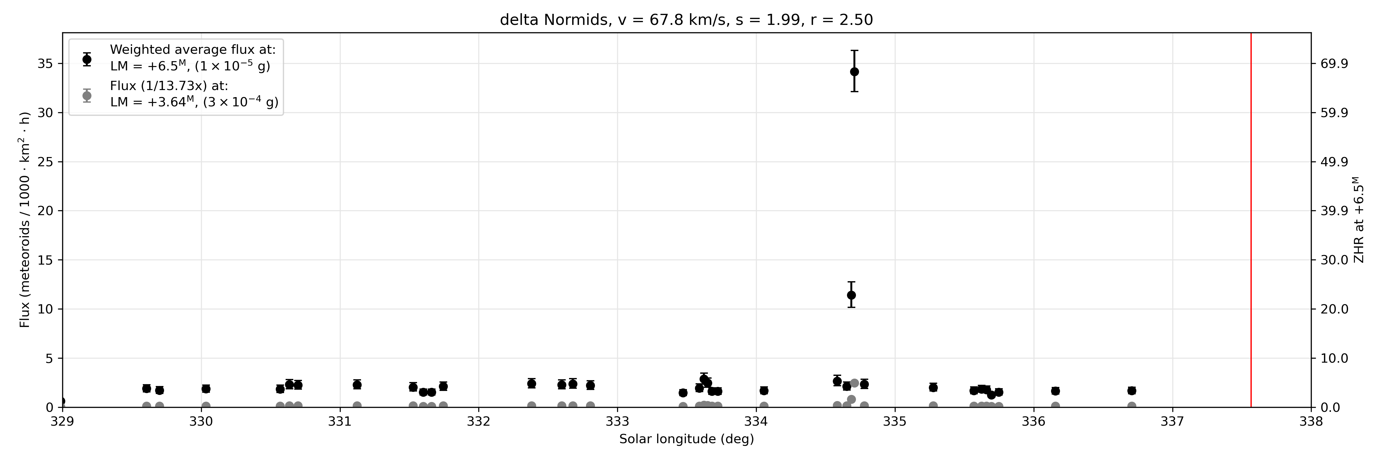 The plots show the measured physical meteor flux (left hand axis) while the equivalent Zenithal Hourly Rate (number of meteors an observer would see under ideal skies with the radiant overhead in an hour) is shown on the right axis as a function of solar longitude (J2000). The assumed population index (which is used to convert flux to ZHR) is assumed constant over the duration of the shower is shown in the header. The equivalent flux to a limiting meteor absolute magnitude of +6.5 and the average limiting meteor magnitude for the measurements are shown, where the equivalent meteoroid mass uses the Mass-Magnitude-Velocity relationship of Verniani (1973). Uncertainties reflect Poisson statistics only (95% confidence interval).